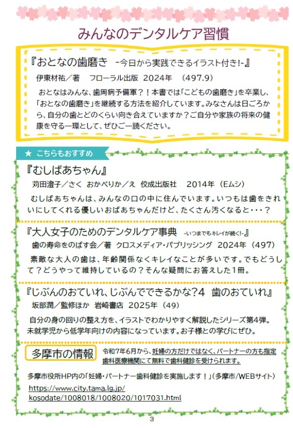今回のテーマは、「こんにちは あかちゃん」「みんなのデンタルケア習慣」「思春期のこころ」「どうしたらいいの?人との関わり方」「犯罪から子どもを守る」「パパ・ライフ」です。