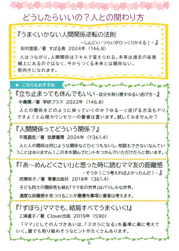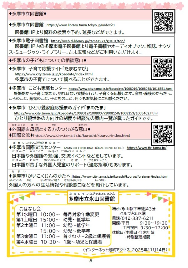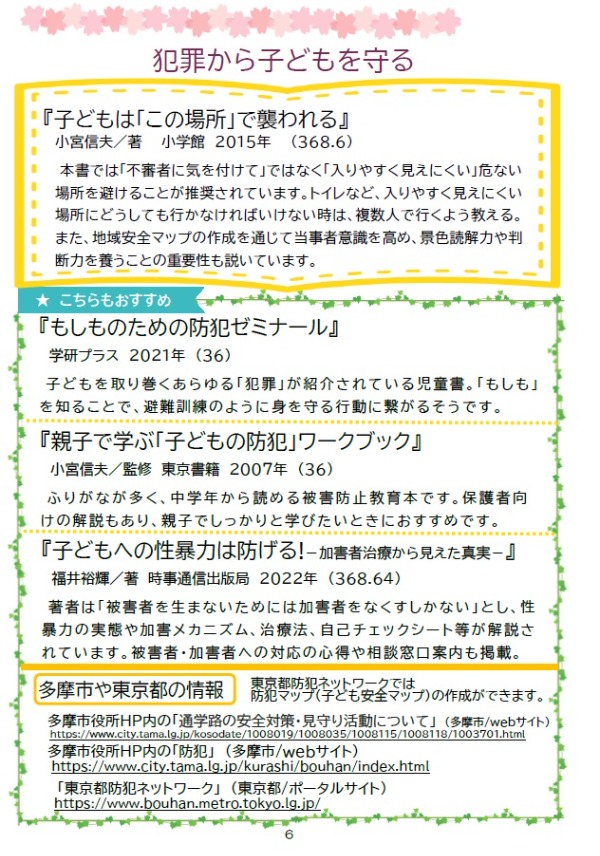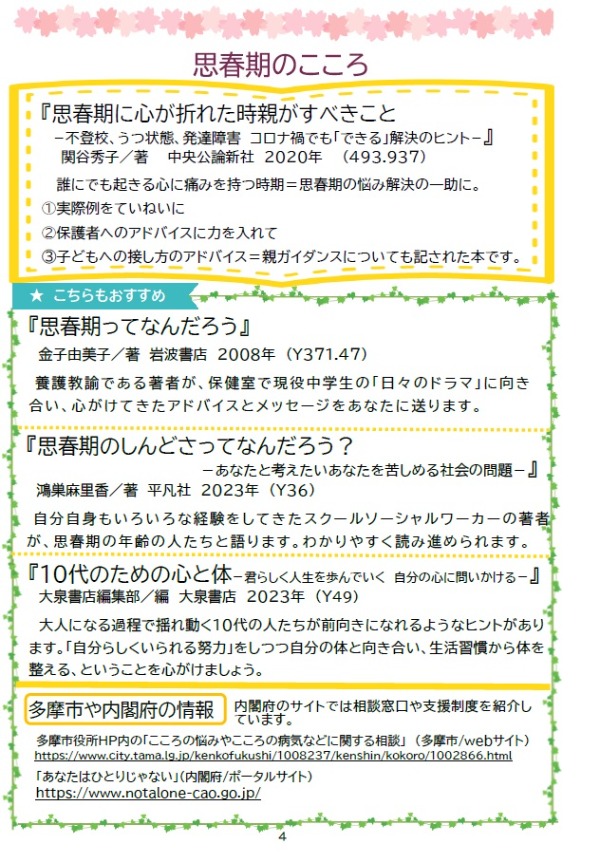 ブックリストには、それぞれのテーマについてのおすすめ本と、「多摩市の子どもについての相談窓口」「外国語を母語とする方のつながる窓口」も掲載しています。